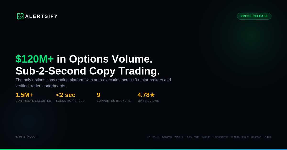 Alertsify has processed over $120 million in options volume and executed more than 1.5 million contracts. The platform reports a platform-wide win rate between 61 and 70 percent and has maintained a 4.78-star rating across 184 reviews.