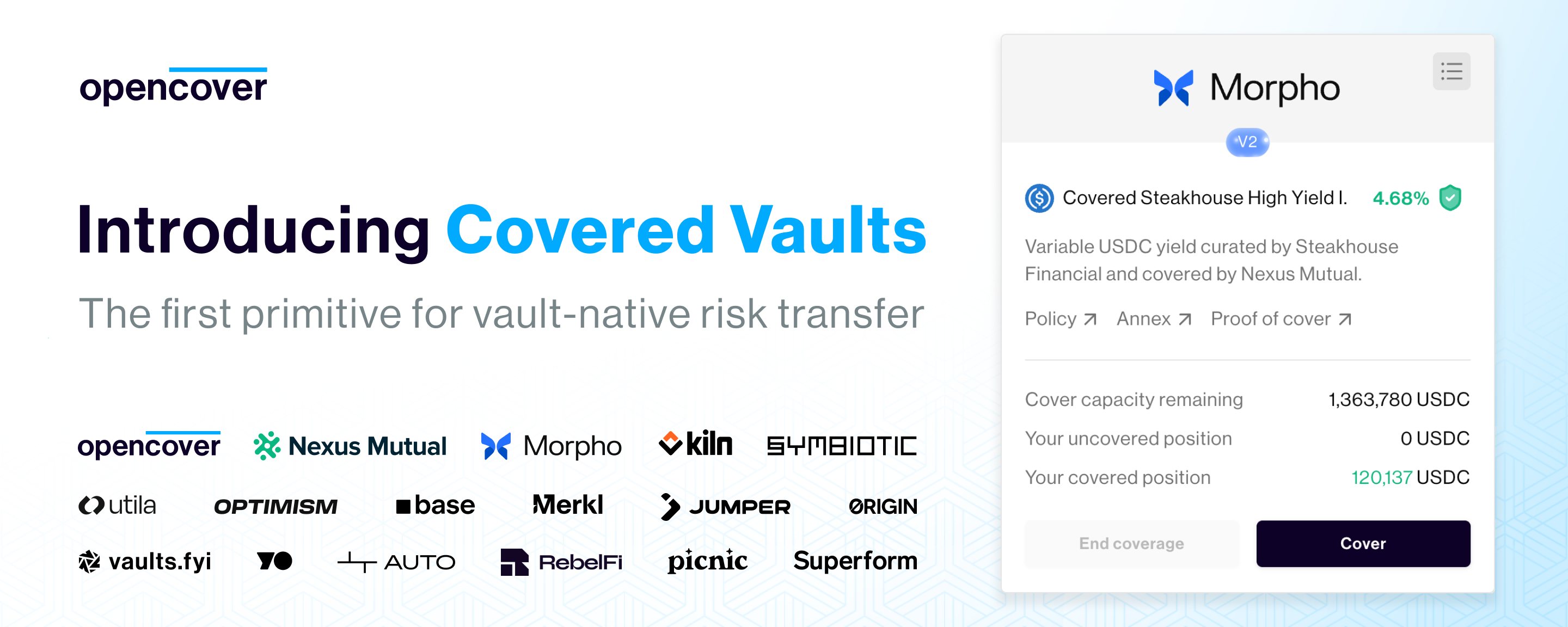 CANNES, FRANCE, April 2, 2026 /EINPresswire.com/ -- OpenCover, a leading platform for onchain insurance and risk transfer, today unveiled Covered Vaults: a new primitive designed to make DeFi vaults safer and investable at scale. The launch follows nine months of development with partners including Nexus Mutual, Morpho, Kiln, Symbiotic, Base, and Merkl.