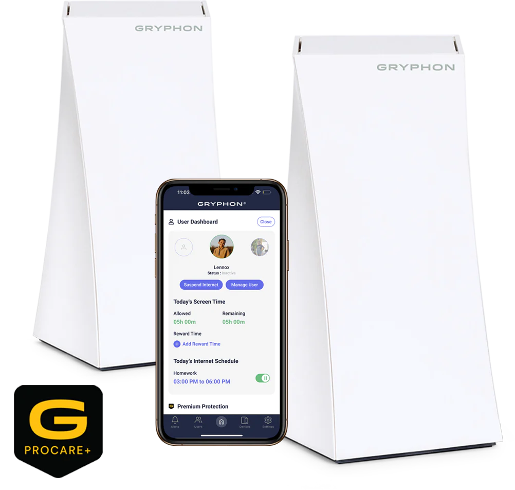 SAN DIEGO, CALIFORNIA, USA, October 19, 2023 /EINPresswire.com/ -- Gryphon, a leader in home network cybersecurity, unveiled its latest innovative service: Gryphon ProCare+. This new service is set to simplify the way families experience internet connectivity and security, offering convenience, and peace of mind. ProCare+ bundles two Gryphon routers for an affordable monthly price of $14.99.The Gryphon ProCare+ service aims to address the evolving challenges of today's connected families. With the proliferation of devices and the growing importance of online safety, Gryphon is delivering an all-encompassing solution that combines advanced security, seamless setup, comprehensive parental controls, and top-notch customer support.