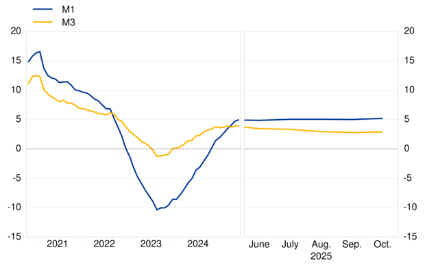 The annual growth rate of the broad monetary aggregate M3 stood at 2.8% in October 2025, unchanged from the previous month, averaging 2.9% in the three months up to October. The components of M3 showed the following developments. The annual growth rate of the narrower aggregate M1, which comprises currency in circulation and overnight deposits, increased to 5.2% in October from 5.0% in September. The annual growth rate of short-term deposits other than overnight deposits (M2-M1) was -1.8% in October, compared with -2.1% in September. The annual growth rate of marketable instruments (M3-M2) decreased to 1.9% in October from 4.3% in September.