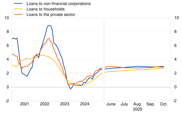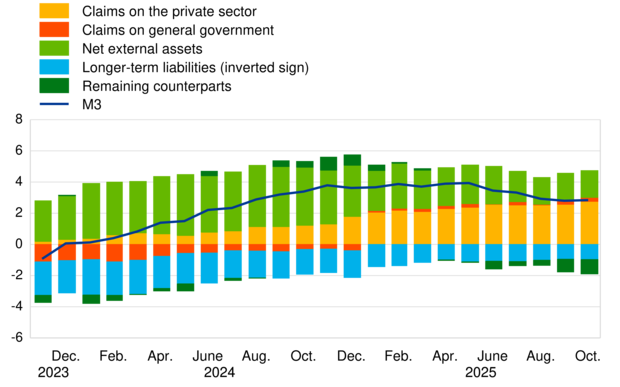 The annual growth rate of M3 in October 2025, as a reflection of changes in the items on the monetary financial institution (MFI) consolidated balance sheet other than M3 (counterparts of M3), can be broken down as follows: claims on the private sector contributed 2.8 percentage points (up from 2.6 percentage points in September), net external assets contributed 1.7 percentage points (down from 1.8 percentage points), claims on general government contributed 0.2 percentage points (as in the previous month), longer-term liabilities contributed -1.0 percentage points (as in the previous month), and the remaining counterparts of M3 contributed -0.9 percentage points (down from -0.8 percentage points).
